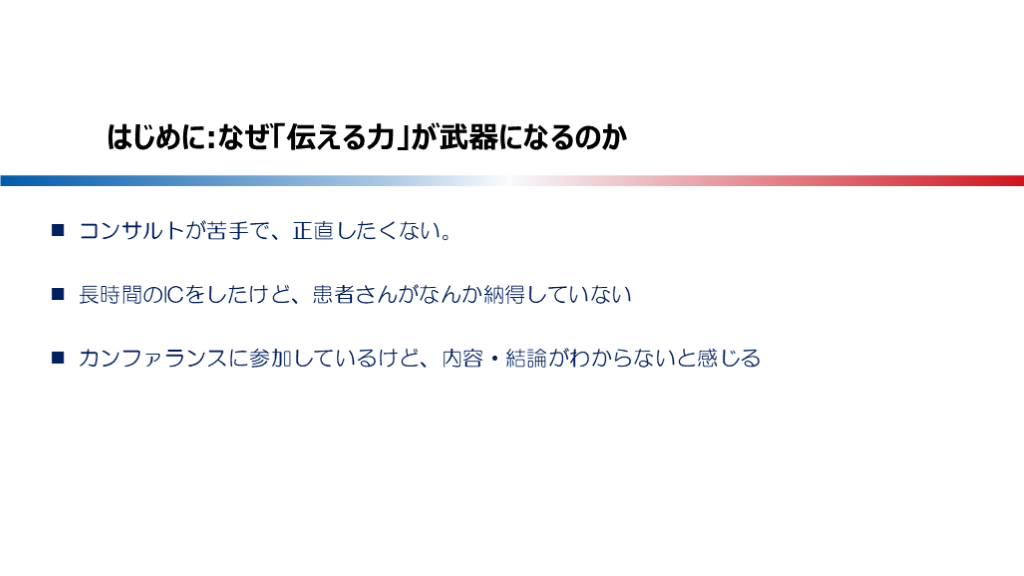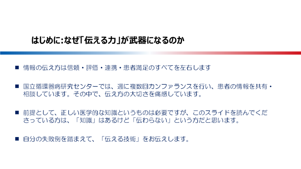 前提として、正しい医学的な知識というものは必要ですが、このスライドを読んでくださっている方は、「知識」はあるけど「伝わらない」という方だと思います。
