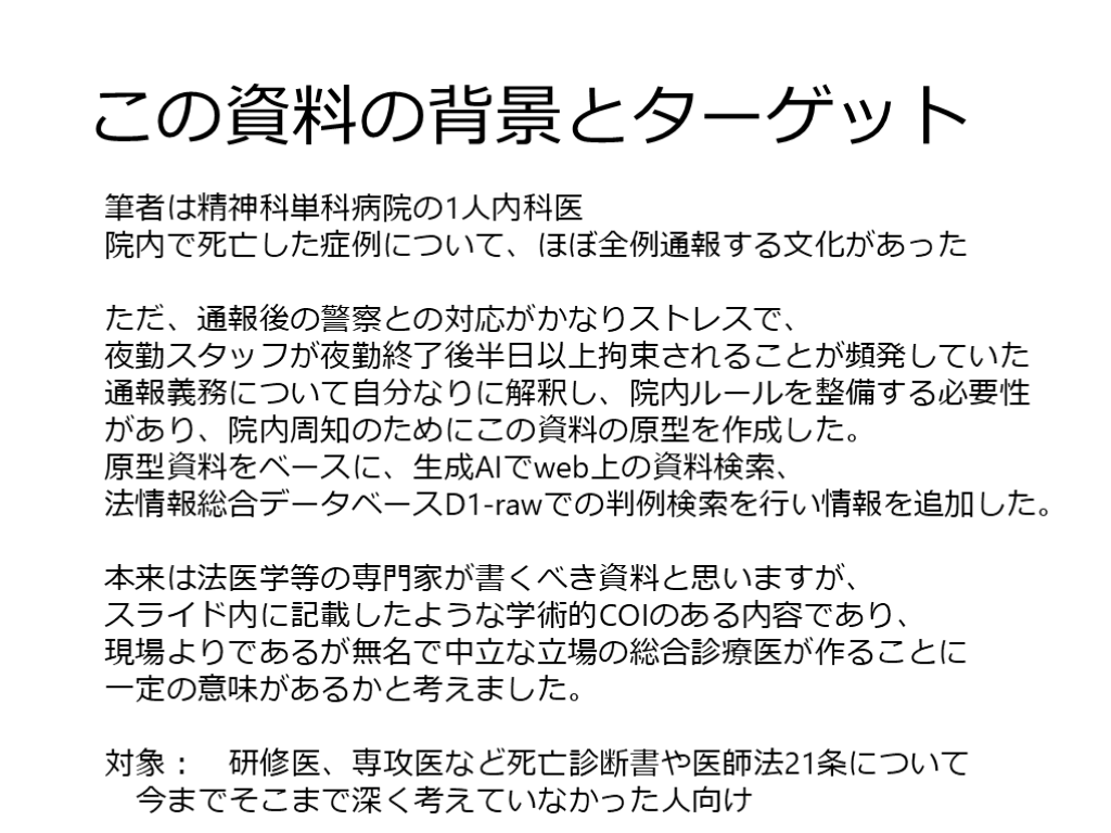 通報義務について自分なりに解釈し、院内ルールを整備する必要性があり、この資料の原型を作成した。