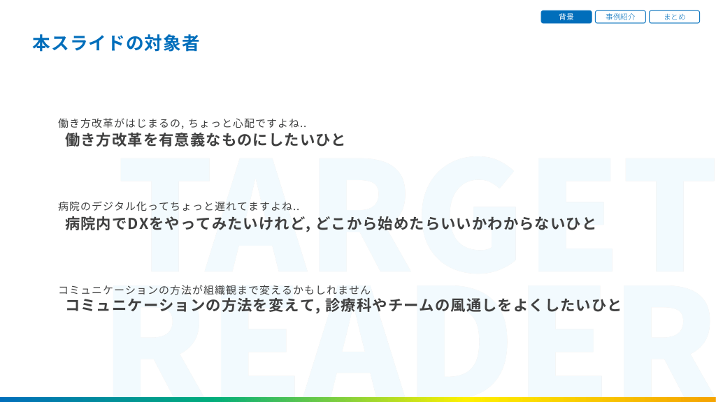 #2. 背景 事例紹介 本スライドの対象者 働き⽅改⾰がはじまるの, ちょっと⼼配ですよね.. 働き⽅改⾰を有意義なものにしたいひと 病院のデジタル化ってちょっと遅れてますよね.. 病院内でDXをやってみたいけれど, どこから始めたらいいかわからないひと コミュニケーションの⽅法が組織観まで変えるかもしれません コミュニケーションの⽅法を変えて, 診療科やチームの⾵通しをよくしたいひと まとめ