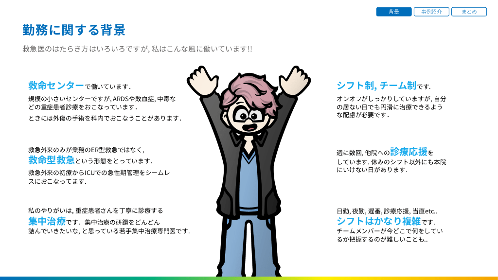 #3. 背景 事例紹介 勤務に関する背景 救急医のはたらき⽅はいろいろですが, 私はこんな⾵に働いています!! 救命センターで働いています. シフト制, チーム制です. 規模の⼩さいセンターですが, ARDSや敗⾎症, 中毒な どの重症患者診療をおこなっています. オンオフがしっかりしていますが, ⾃分 の居ない⽇でも円滑に治療できるよう な配慮が必要です. ときには外傷の⼿術を科内でおこなうことがあります. 救急外来のみが業務のER型救急ではなく, 救命型救急という形態をとっています. 救急外来の初療からICUでの急性期管理をシームレ スにおこなってます. 週に数回, 他院への診療応援を しています. 休みのシフト以外にも本院 にいけない⽇があります. 私のやりがいは, 重症患者さんを丁寧に診療する ⽇勤, 夜勤, 遅番, 診療応援, 当直etc.. 詰んでいきたいな, と思っている若⼿集中治療専⾨医です. チームメンバーが今どこで何をしてい るか把握するのが難しいことも.. 集中治療です.集中治療の研鑽をどんどん シフトはかなり複雑です. まとめ