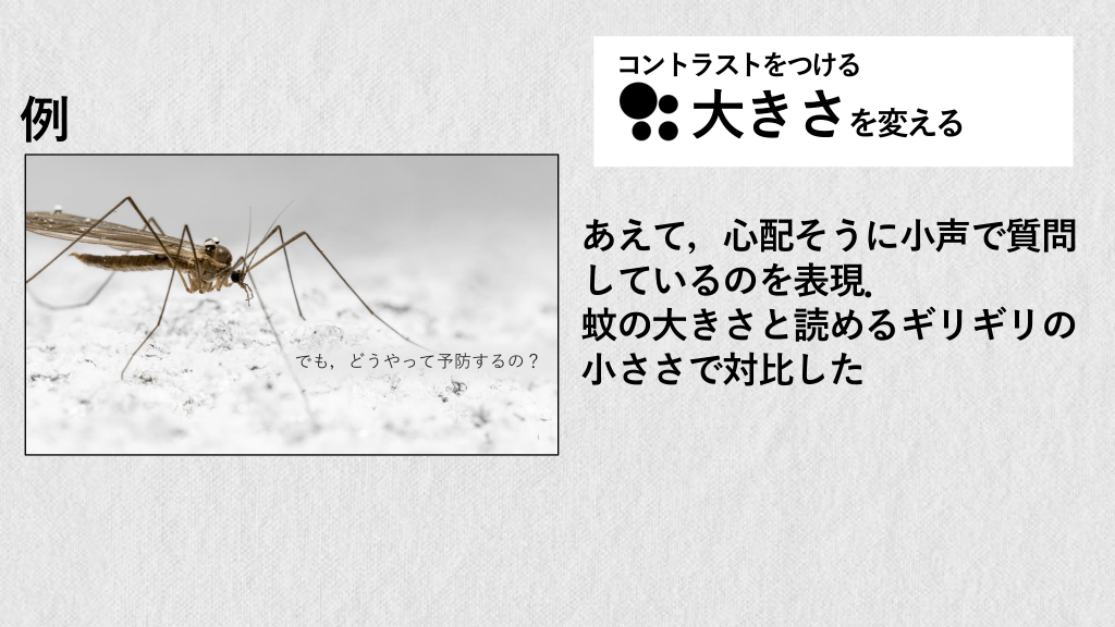#10. コントラストをつける 例 大きさを変える あえて,心配そうに小声で質問 しているのを表現. 蚊の大きさと読めるギリギリの 小ささで対比した