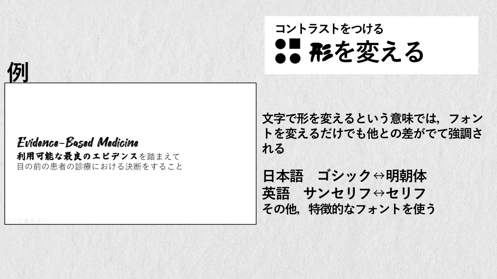 #12. コントラストをつける 例 形を変える 文字で形を変えるという意味では,フォン トを変えるだけでも他との差がでて強調さ れる 日本語 ゴシック↔明朝体 英語 サンセリフ↔セリフ その他,特徴的なフォントを使う