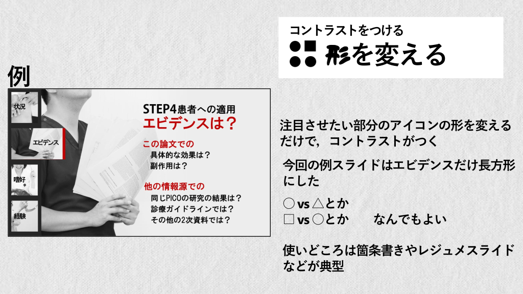 #13. コントラストをつける 例 形を変える 注目させたい部分のアイコンの形を変える だけで,コントラストがつく 今回の例スライドはエビデンスだけ長方形 にした ○ vs △とか □ vs ○とか なんでもよい 使いどころは箇条書きやレジュメスライド などが典型