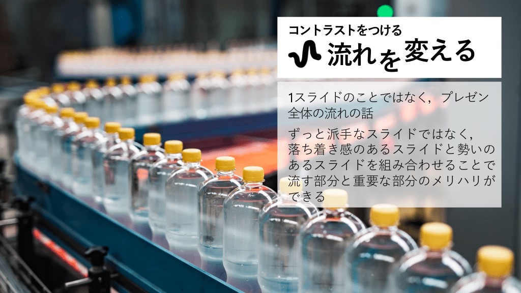 #14. コントラストをつける 流れを変える 1スライドのことではなく,プレゼン 全体の流れの話 ずっと派手なスライドではなく, 落ち着き感のあるスライドと勢いの あるスライドを組み合わせることで 流す部分と重要な部分のメリハリが できる
