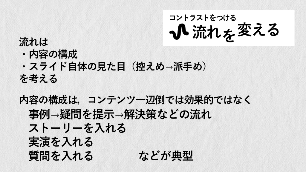 #15. コントラストをつける 流れを変える 流れは ・内容の構成 ・スライド自体の見た目(控えめ→派手め) を考える 内容の構成は,コンテンツ一辺倒では効果的ではなく 事例→疑問を提示→解決策などの流れ ストーリーを入れる 実演を入れる 質問を入れる などが典型