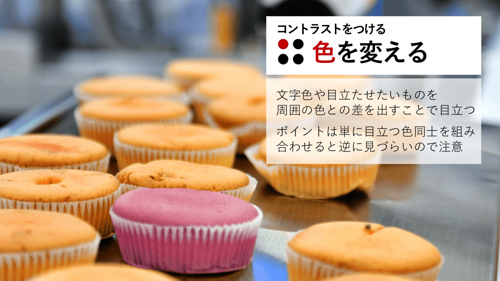 #5. コントラストをつける 色を変える 文字色や目立たせたいものを 周囲の色との差を出すことで目立つ ポイントは単に目立つ色同士を組み 合わせると逆に見づらいので注意
