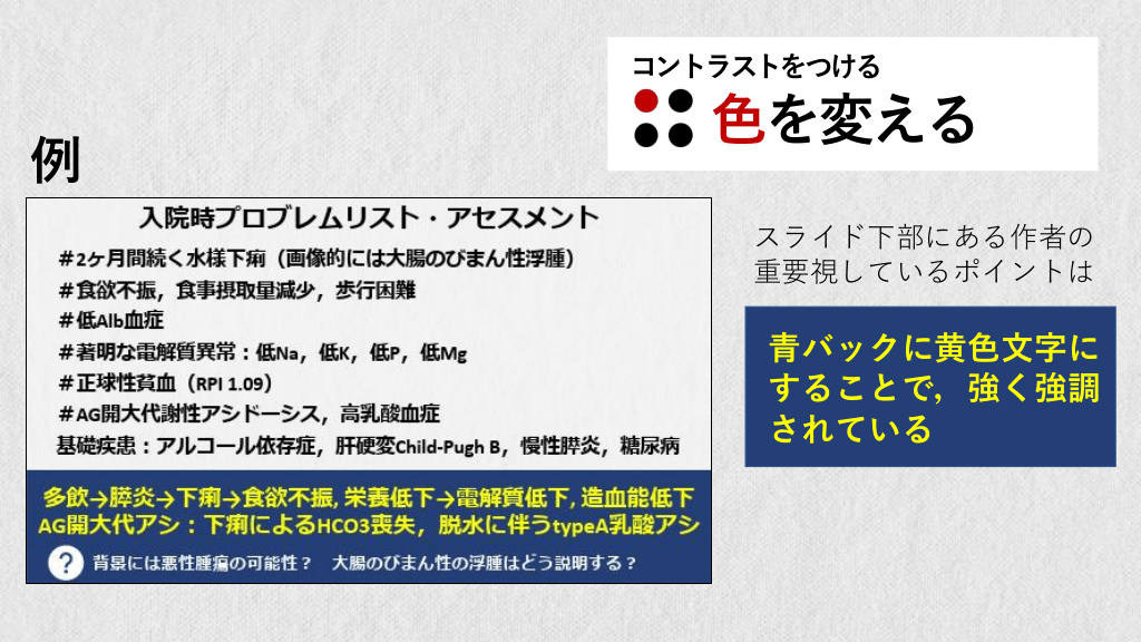 #6. コントラストをつける 例 色を変える スライド下部にある作者の 重要視しているポイントは 青バックに黄色文字に することで,強く強調 されている