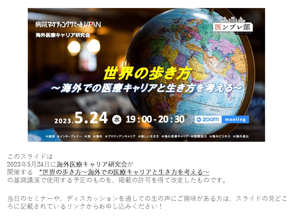 #2. このスライドは2023年5月24日に海外医療キャリア研究会が開催する “世界の歩き方〜海外での医療キャリアと生き方を考える〜の基調講演で使用する予定のものを、掲載の許可を得て改変したものです。