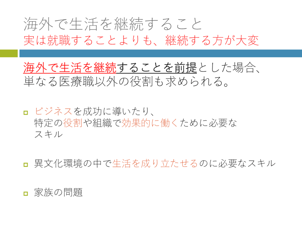 #4. 海外で生活を継続すること実は就職することよりも、継続する方が大変 海外で生活を継続することを前提とした場合、単なる医療職以外の役割も求められる。