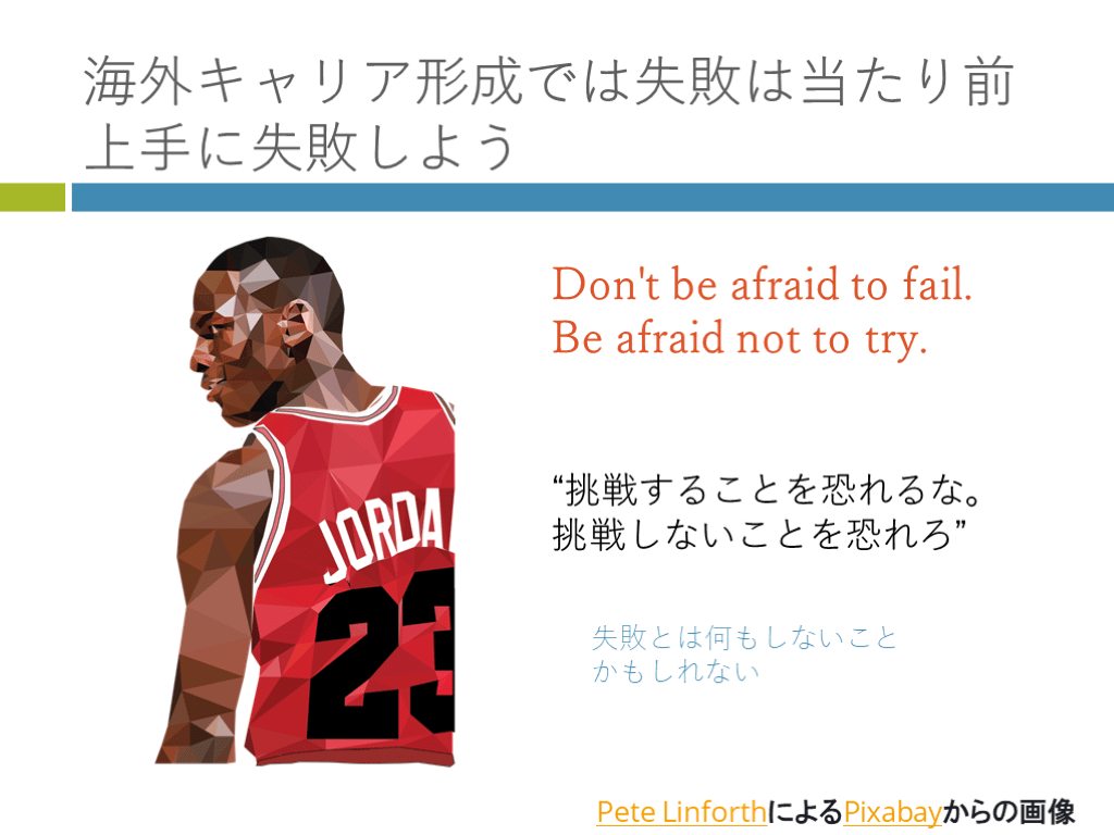 #8. 海外キャリア形成では失敗は当たり前上手に失敗しよう Don't be afraid to fail. Be afraid not to try. Pete LinforthによるPixabayからの画像 “挑戦することを恐れるな。挑戦しないことを恐れろ”