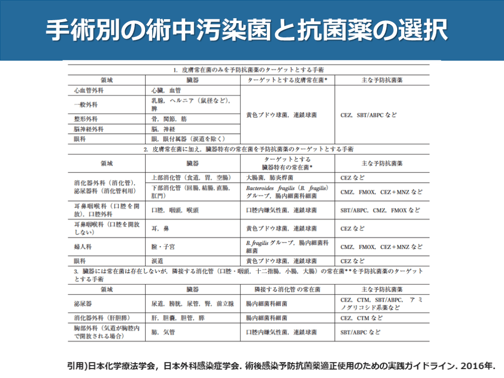 #5. 手術別の術中汚染菌と抗菌薬の選択 引用)日本化学療法学会,日本外科感染症学会. 術後感染予防抗菌薬適正使用のための実践ガイドライン. 2016年.