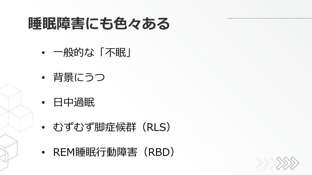 #10. 睡眠障害にも色々ある • 一般的な「不眠」 • 背景にうつ • 日中過眠 • むずむず脚症候群(RLS) • REM睡眠行動障害(RBD)