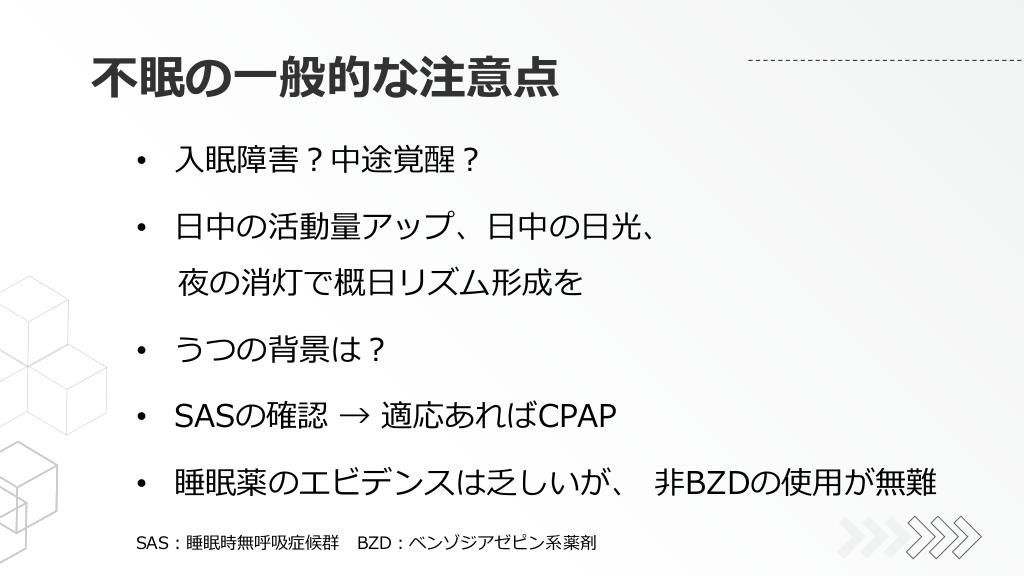 #11. 不眠の一般的な注意点 • 入眠障害?中途覚醒? • 日中の活動量アップ、日中の日光、 夜の消灯で概日リズム形成を • うつの背景は? • SASの確認 → 適応あればCPAP • 睡眠薬のエビデンスは乏しいが、 非BZDの使用が無難 SAS:睡眠時無呼吸症候群 BZD:ベンゾジアゼピン系薬剤