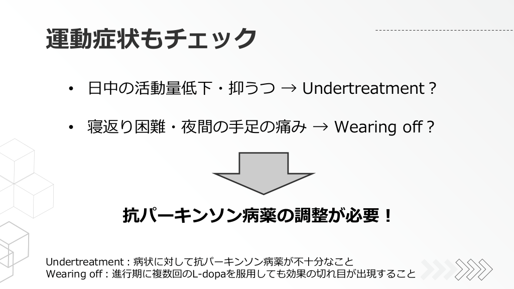 #12. 運動症状もチェック • 日中の活動量低下・抑うつ → Undertreatment? • 寝返り困難・夜間の手足の痛み → Wearing off? 抗パーキンソン病薬の調整が必要! Undertreatment:病状に対して抗パーキンソン病薬が不十分なこと Wearing off:進行期に複数回のL-dopaを服用しても効果の切れ目が出現すること