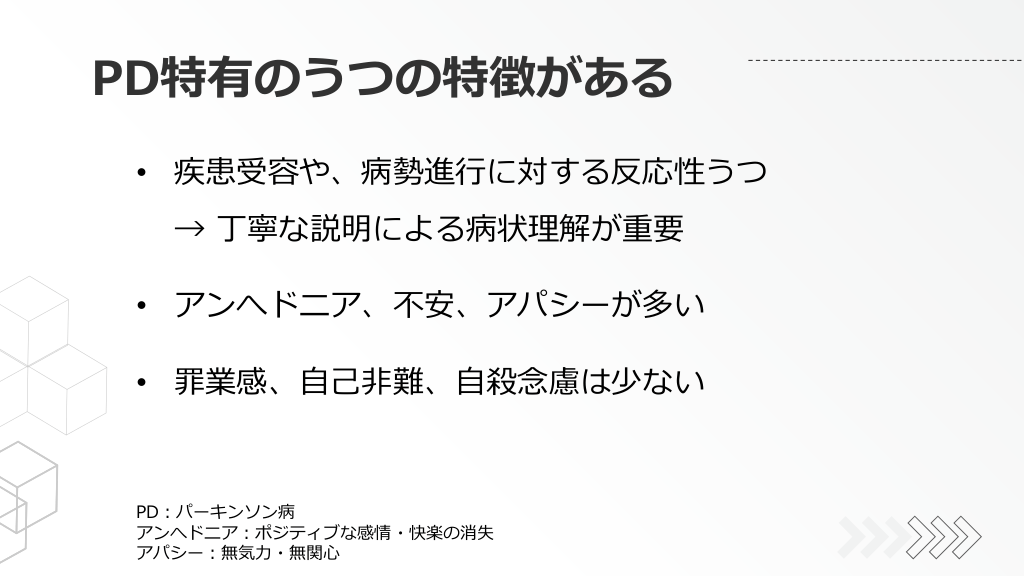 #13. PD特有のうつの特徴がある • 疾患受容や、病勢進行に対する反応性うつ → 丁寧な説明による病状理解が重要 • アンへドニア、不安、アパシーが多い • 罪業感、自己非難、自殺念慮は少ない PD:パーキンソン病 アンへドニア:ポジティブな感情・快楽の消失 アパシー:無気力・無関心