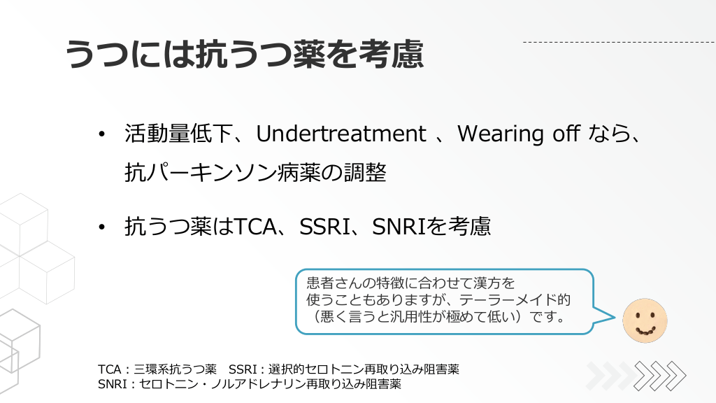 #14. うつには抗うつ薬を考慮 • 活動量低下、Undertreatment 、Wearing off なら、 抗パーキンソン病薬の調整 • 抗うつ薬はTCA、SSRI、SNRIを考慮 患者さんの特徴に合わせて漢方を 使うこともありますが、テーラーメイド的 (悪く言うと汎用性が極めて低い)です。 TCA:三環系抗うつ薬 SSRI:選択的セロトニン再取り込み阻害薬 SNRI:セロトニン・ノルアドレナリン再取り込み阻害薬