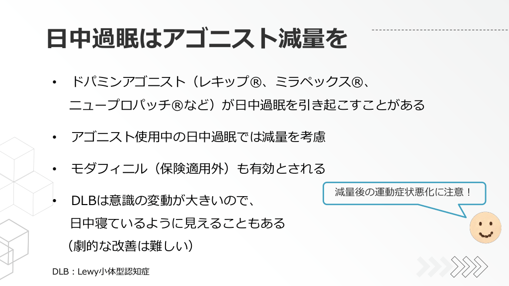 #15. 日中過眠はアゴニスト減量を • ドパミンアゴニスト(レキップ®、ミラペックス®、 ニュープロパッチ®など)が日中過眠を引き起こすことがある • アゴニスト使用中の日中過眠では減量を考慮 • モダフィニル(保険適用外)も有効とされる • DLBは意識の変動が大きいので、 日中寝ているように見えることもある (劇的な改善は難しい) DLB:Lewy小体型認知症 減量後の運動症状悪化に注意!