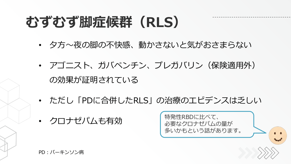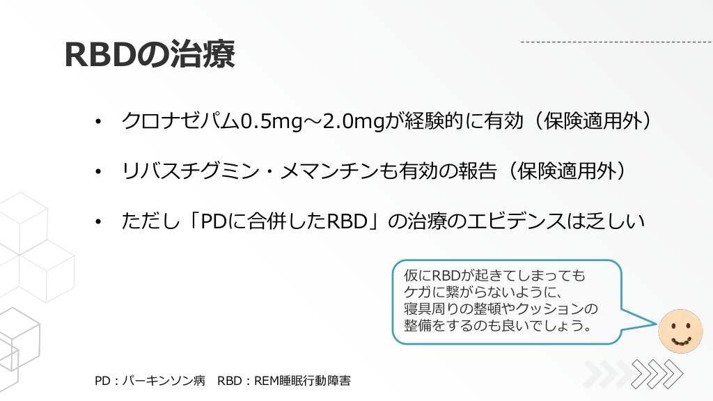 #18. RBDの治療 • クロナゼパム0.5mg~2.0mgが経験的に有効(保険適用外) • リバスチグミン・メマンチンも有効の報告(保険適用外) • ただし「PDに合併したRBD」の治療のエビデンスは乏しい 仮にRBDが起きてしまっても ケガに繋がらないように、 寝具周りの整頓やクッションの 整備をするのも良いでしょう。 PD:パーキンソン病 RBD:REM睡眠行動障害