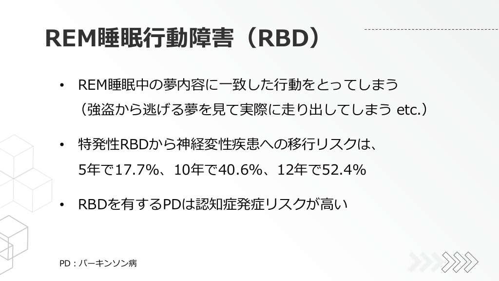 #17. REM睡眠行動障害(RBD) • REM睡眠中の夢内容に一致した行動をとってしまう (強盗から逃げる夢を見て実際に走り出してしまう etc.) • 特発性RBDから神経変性疾患への移行リスクは、 5年で17.7%、10年で40.6%、12年で52.4% • RBDを有するPDは認知症発症リスクが高い PD:パーキンソン病
