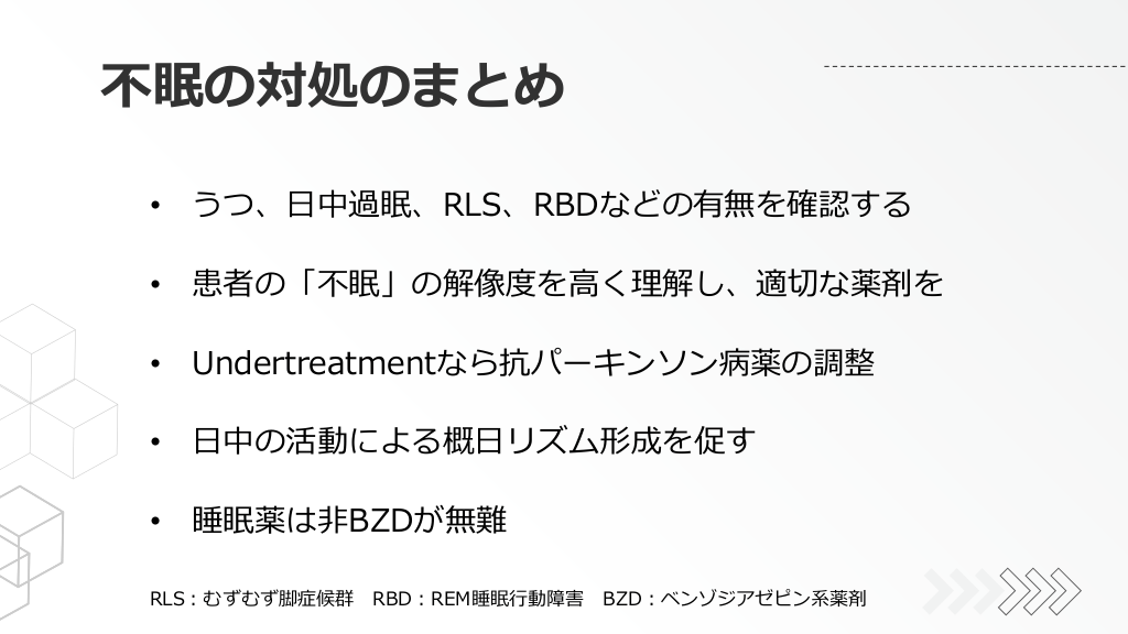 #19. 不眠の対処のまとめ • うつ、日中過眠、RLS、RBDなどの有無を確認する • 患者の「不眠」の解像度を高く理解し、適切な薬剤を • Undertreatmentなら抗パーキンソン病薬の調整 • 日中の活動による概日リズム形成を促す • 睡眠薬は非BZDが無難 RLS:むずむず脚症候群 RBD:REM睡眠行動障害 BZD:ベンゾジアゼピン系薬剤