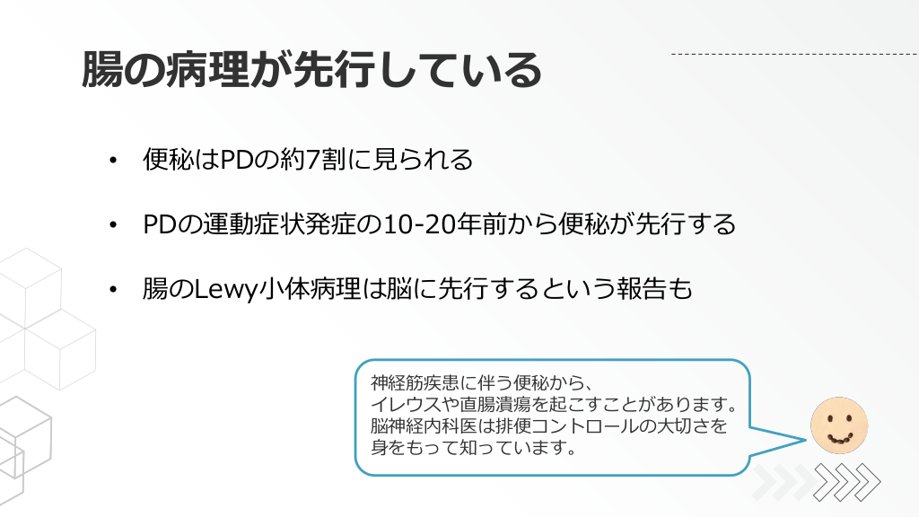 #21. 腸の病理が先行している • 便秘はPDの約7割に見られる • PDの運動症状発症の10-20年前から便秘が先行する • 腸のLewy小体病理は脳に先行するという報告も 神経筋疾患に伴う便秘から、 イレウスや直腸潰瘍を起こすことがあります。 脳神経内科医は排便コントロールの大切さを 身をもって知っています。