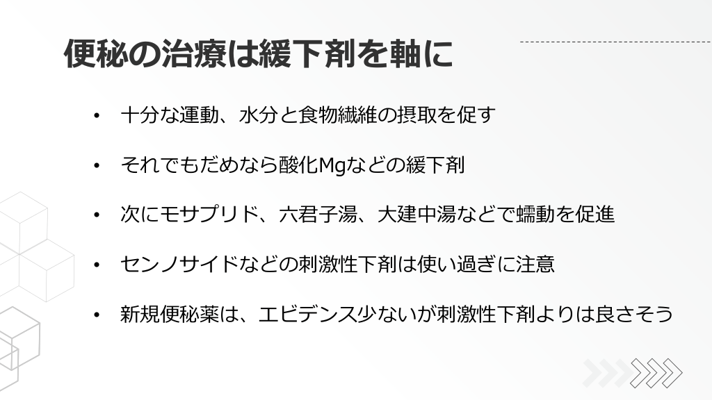 #22. 便秘の治療は緩下剤を軸に • 十分な運動、水分と食物繊維の摂取を促す • それでもだめなら酸化Mgなどの緩下剤 • 次にモサプリド、六君子湯、大建中湯などで蠕動を促進 • センノサイドなどの刺激性下剤は使い過ぎに注意 • 新規便秘薬は、エビデンス少ないが刺激性下剤よりは良さそう