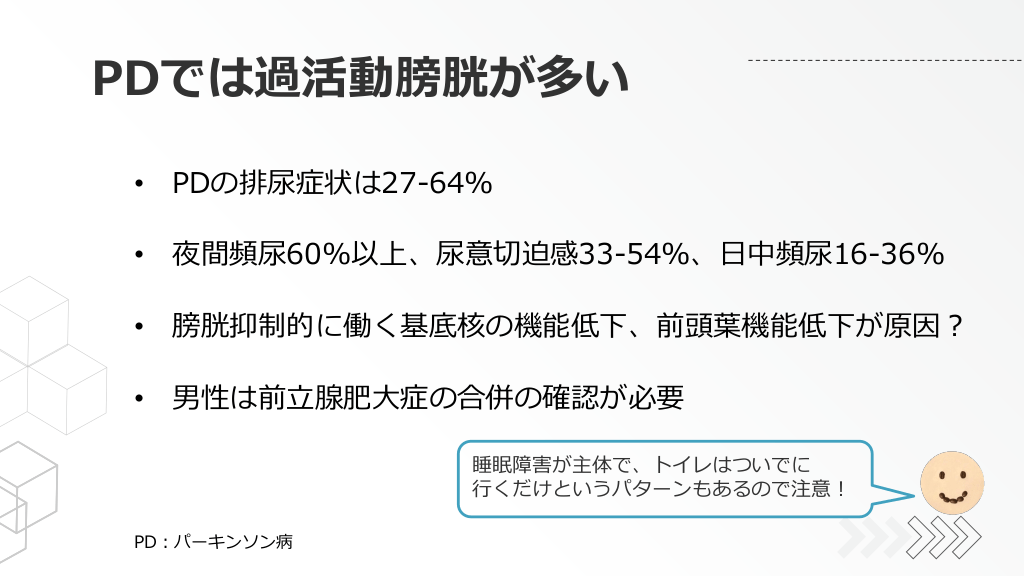 #24. PDでは過活動膀胱が多い • PDの排尿症状は27-64% • 夜間頻尿60%以上、尿意切迫感33-54%、日中頻尿16-36% • 膀胱抑制的に働く基底核の機能低下、前頭葉機能低下が原因? • 男性は前立腺肥大症の合併の確認が必要 睡眠障害が主体で、トイレはついでに 行くだけというパターンもあるので注意! PD:パーキンソン病