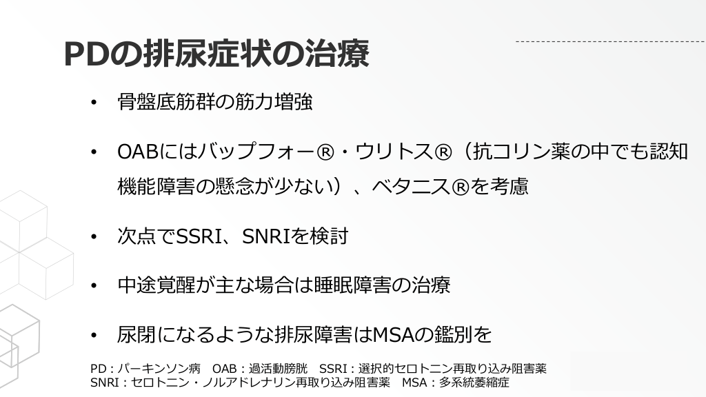 #25. PDの排尿症状の治療 • 骨盤底筋群の筋力増強 • OABにはバップフォー®・ウリトス®(抗コリン薬の中でも認知 機能障害の懸念が少ない)、ベタニス®を考慮 • 次点でSSRI、SNRIを検討 • 中途覚醒が主な場合は睡眠障害の治療 • 尿閉になるような排尿障害はMSAの鑑別を PD:パーキンソン病 OAB:過活動膀胱 SSRI:選択的セロトニン再取り込み阻害薬 SNRI:セロトニン・ノルアドレナリン再取り込み阻害薬 MSA:多系統萎縮症