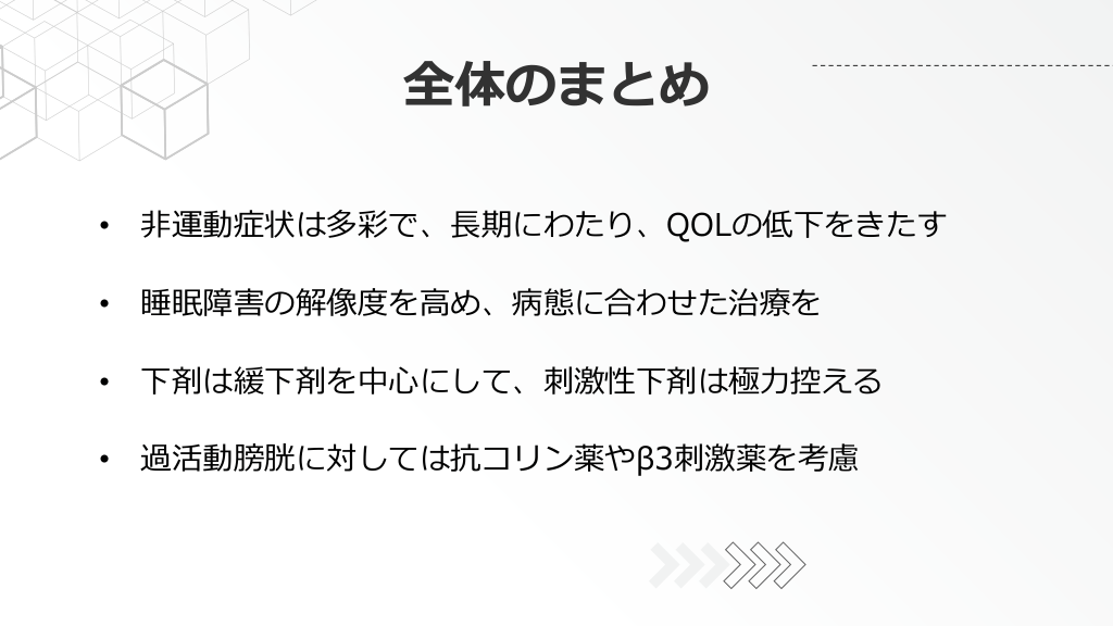 #26. 全体のまとめ • 非運動症状は多彩で、長期にわたり、QOLの低下をきたす • 睡眠障害の解像度を高め、病態に合わせた治療を • 下剤は緩下剤を中心にして、刺激性下剤は極力控える • 過活動膀胱に対しては抗コリン薬やβ3刺激薬を考慮
