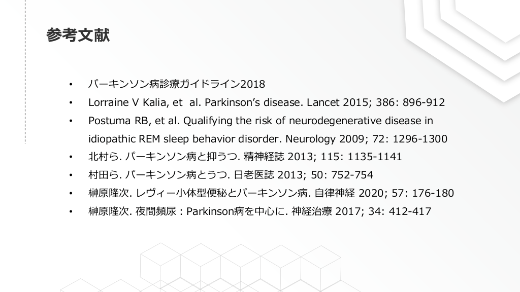 #27. 参考文献 • パーキンソン病診療ガイドライン2018 • Lorraine V Kalia, et al. Parkinson’s disease. Lancet 2015; 386: 896-912 • Postuma RB, et al. Qualifying the risk of neurodegenerative disease in idiopathic REM sleep behavior disorder. Neurology 2009; 72: 1296-1300 • 北村ら. パーキンソン病と抑うつ. 精神経誌 2013; 115: 1135-1141 • 村田ら. パーキンソン病とうつ. 日老医誌 2013; 50: 752-754 • 榊原隆次. レヴィー小体型便秘とパーキンソン病. 自律神経 2020; 57: 176-180 • 榊原隆次. 夜間頻尿:Parkinson病を中心に. 神経治療 2017; 34: 412-417