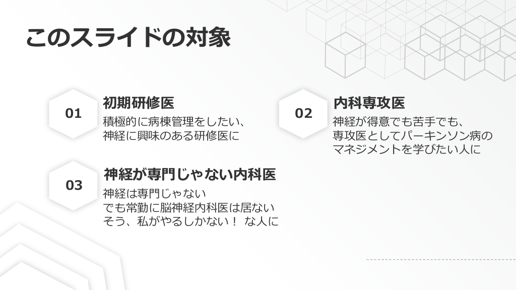 #3. このスライドの対象 01 03 初期研修医 積極的に病棟管理をしたい、 神経に興味のある研修医に 神経が専門じゃない内科医 神経は専門じゃない でも常勤に脳神経内科医は居ない そう、私がやるしかない! な人に 02 内科専攻医 神経が得意でも苦手でも、 専攻医としてパーキンソン病の マネジメントを学びたい人に