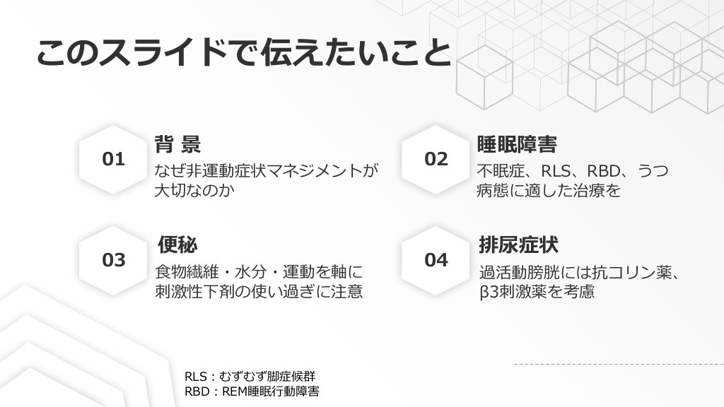 #4. このスライドで伝えたいこと 01 03 背景 なぜ非運動症状マネジメントが 大切なのか 便秘 食物繊維・水分・運動を軸に 刺激性下剤の使い過ぎに注意 RLS:むずむず脚症候群 RBD:REM睡眠行動障害 02 04 睡眠障害 不眠症、RLS、RBD、うつ 病態に適した治療を 排尿症状 過活動膀胱には抗コリン薬、 β3刺激薬を考慮