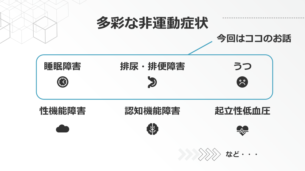#7. 多彩な非運動症状 今回はココのお話 睡眠障害 排尿・排便障害 うつ 性機能障害 認知機能障害 起立性低血圧 など・・・
