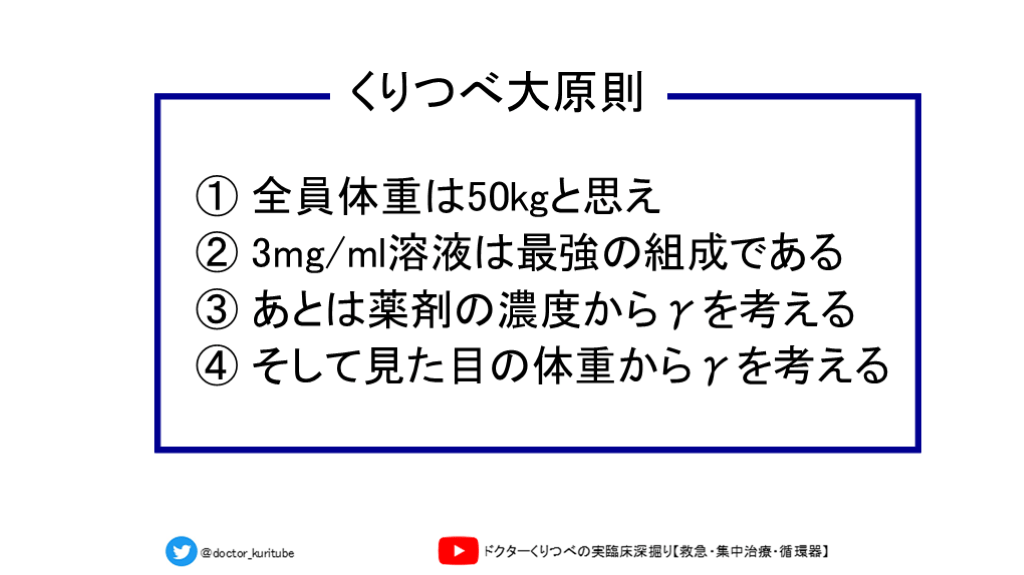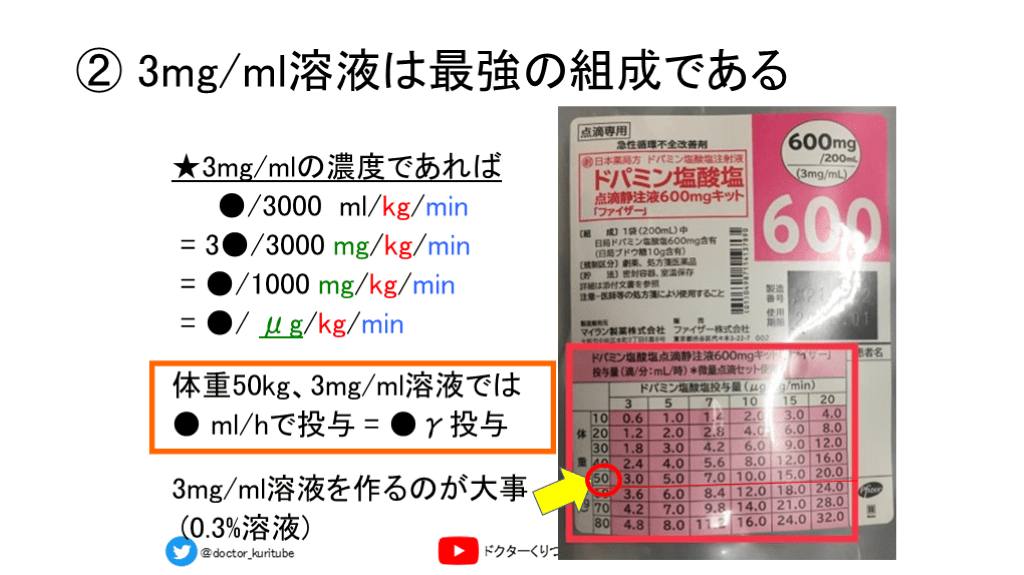 心拍数、血圧を測定し1~10μg/kg/minの用量で適宜調節する (例)ランジオロール いろんな参考書を読んでも溶き方などは一定していない