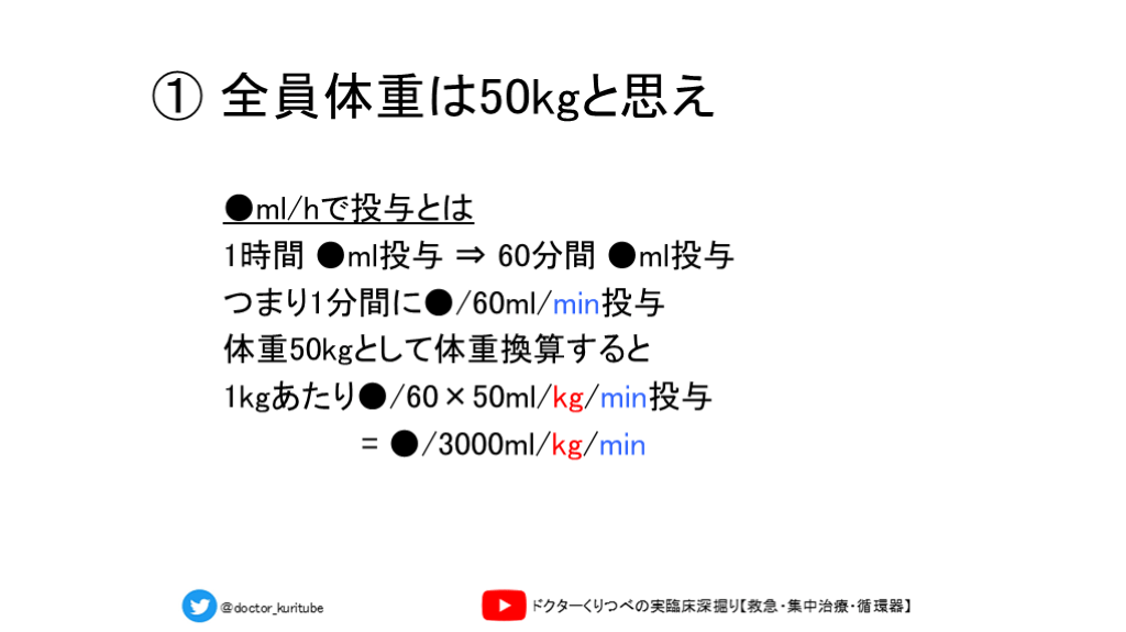 #8. ① 全員体重は50kgと思え ●ml/hで投与とは