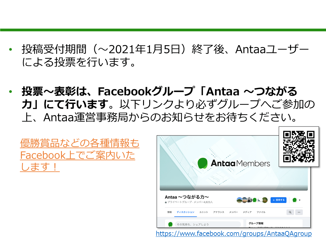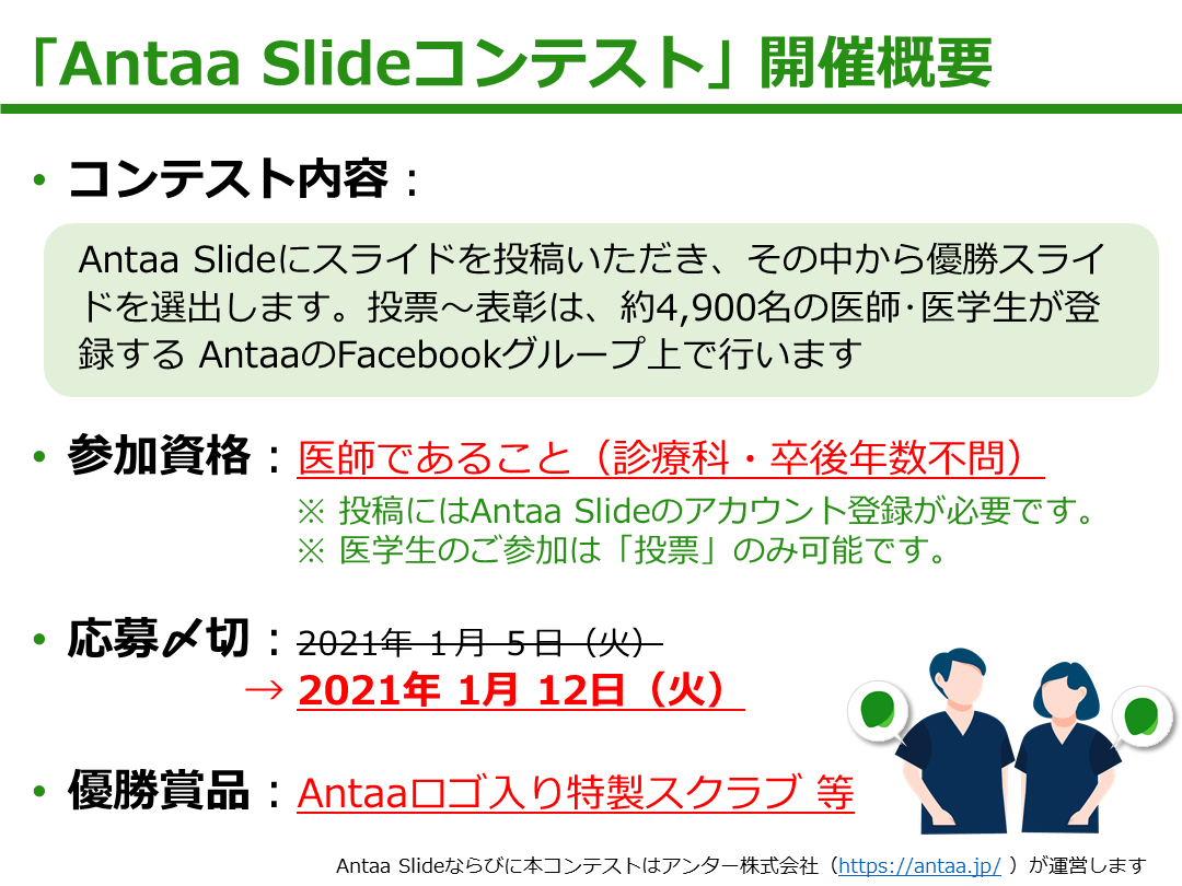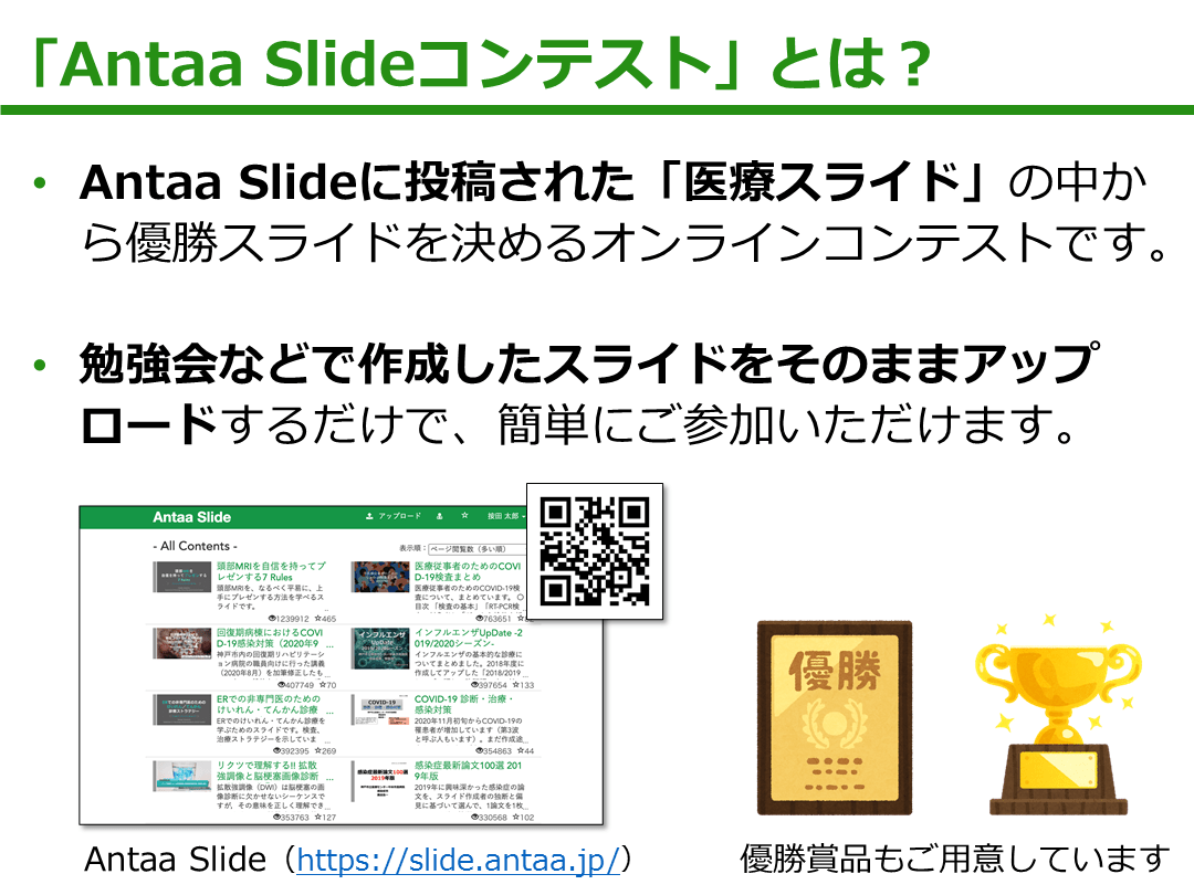 ※「研修医部門」「専攻医部門」「一般部門」の三部門から一名ずつ優勝スライドを選出します。投票〜表彰は、AntaaのFacebookグループ上で行います。