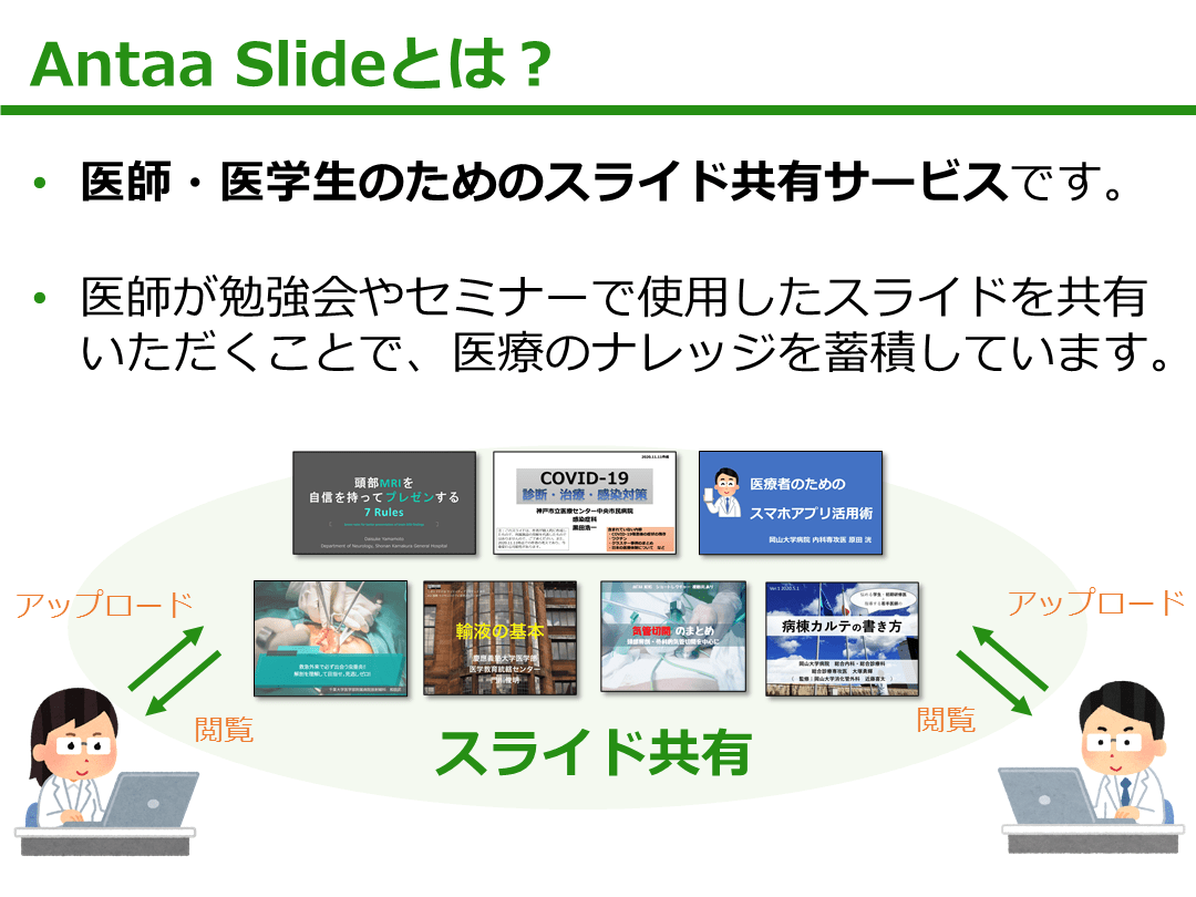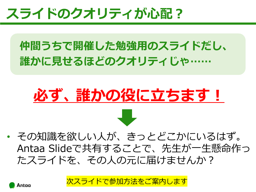 → その知識を欲しい人が、きっとどこかにいるはず。Antaa Slideで共有することで、先生が一生懸命作ったスライドをその人の元に届けませんか? いつか必ず、 誰かの役に立ちます!
