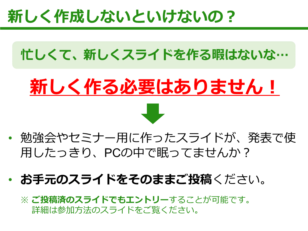 → 新しく作る必要はありません!勉強会やセミナー用に作ったスライドが、PCの中で眠ってませんか? お手元のスライドをそのままご投稿ください。