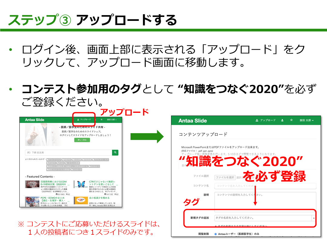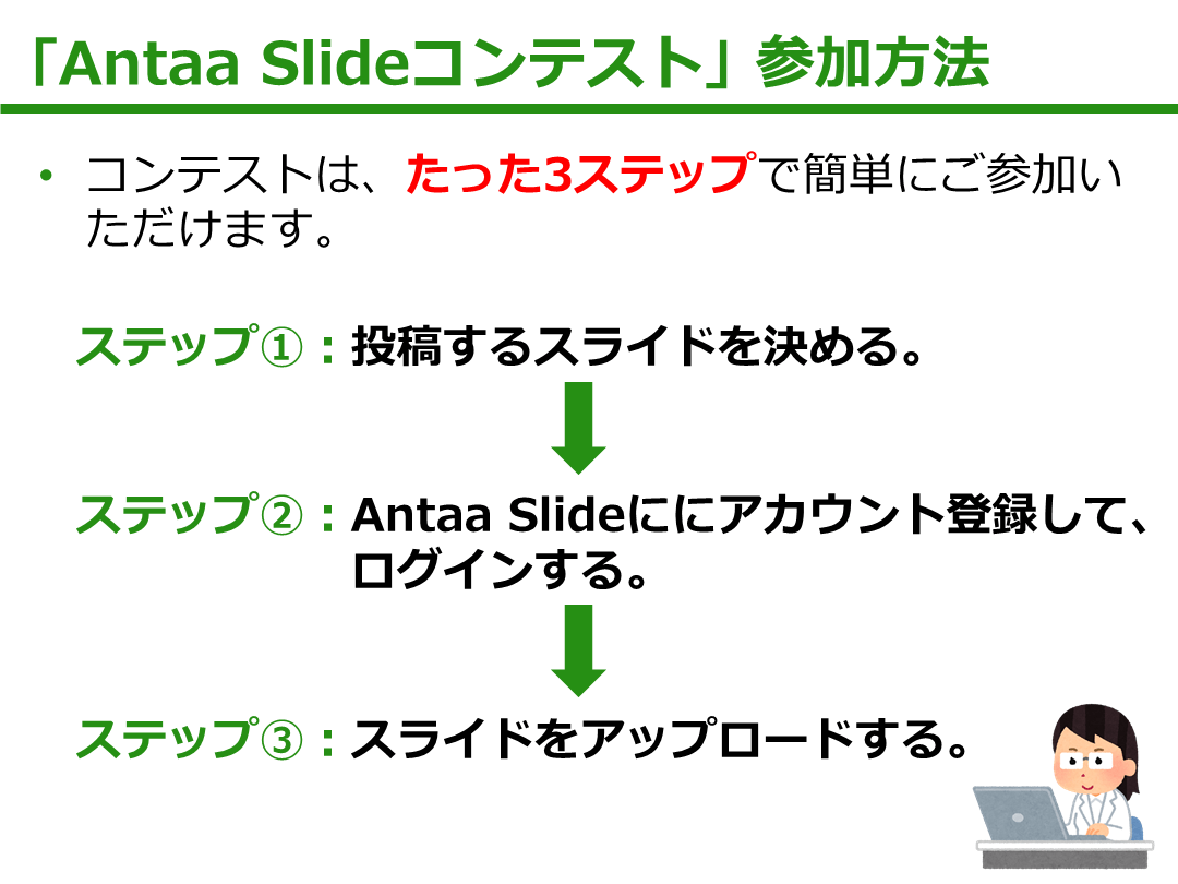 第1回 Antaa Slideコンテスト「知識をつなぐ」へのエントリー方法をご案内します。PCに眠っているスライドを投稿して、“知識をつないで”みませんか?