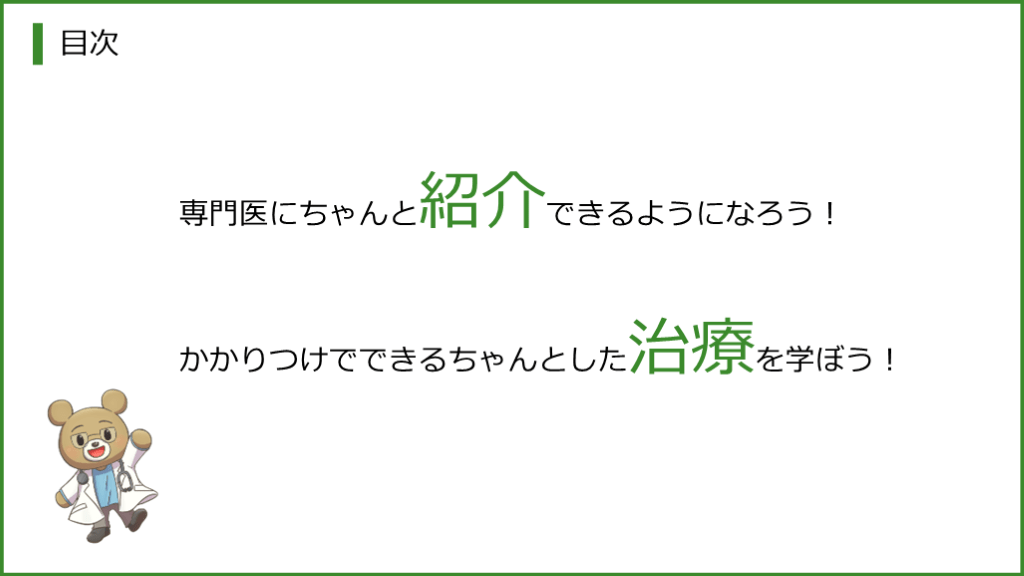 #4. 目次 専門医にちゃんと紹介できるようになろう! かかりつけでできるちゃんとした治療を学ぼう!