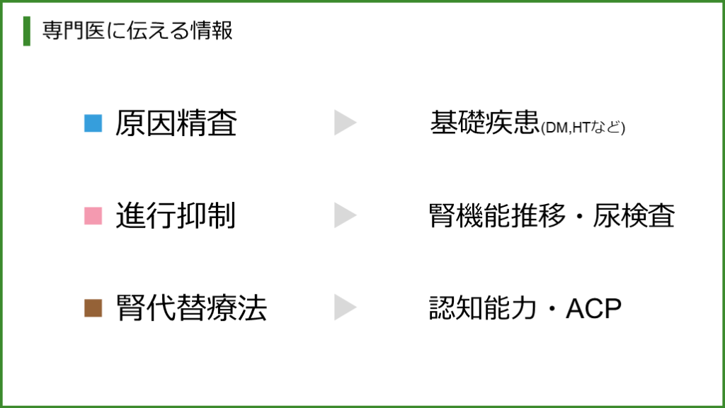 #17. 専門医に伝える情報 基礎疾患(DM,HTなど) 腎機能推移・尿検査 認知能力・ACP 原因精査 腎代替療法 進行抑制