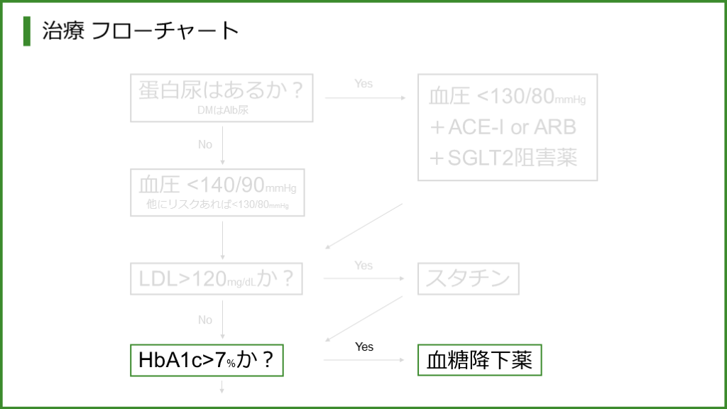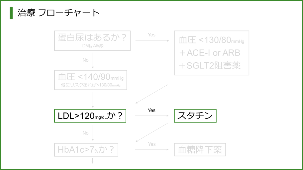 他にリスクあれば<130/80mmHg LDL>120mg/dLか? HbA1c>7%か? スタチン 血糖降下薬