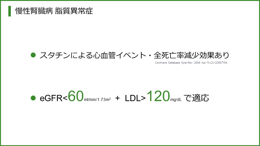 #26. 慢性腎臓病 脂質異常症 eGFR<60ml/min/1.73m2 + LDL>120mg/dL で適応