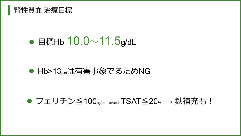 #34. 腎性貧血 治療目標 目標Hb 10.0〜11.5g/dL Hb>13g/dlは有害事象でるためNG フェリチン≦100ng/mL or/and TSAT≦20% → 鉄補充も!