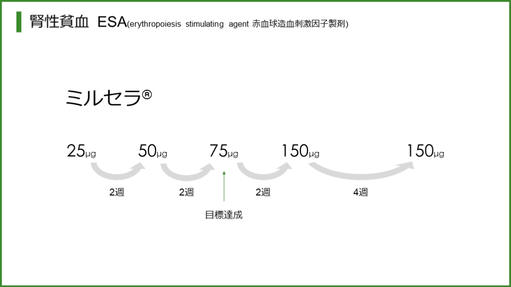 #35. 腎性貧血 ESA(erythropoiesis stimulating agent 赤血球造血刺激因子製剤) ミルセラ®︎ 25μg 50μg 75μg 150μg 150μg 2週 2週 2週 4週 目標達成