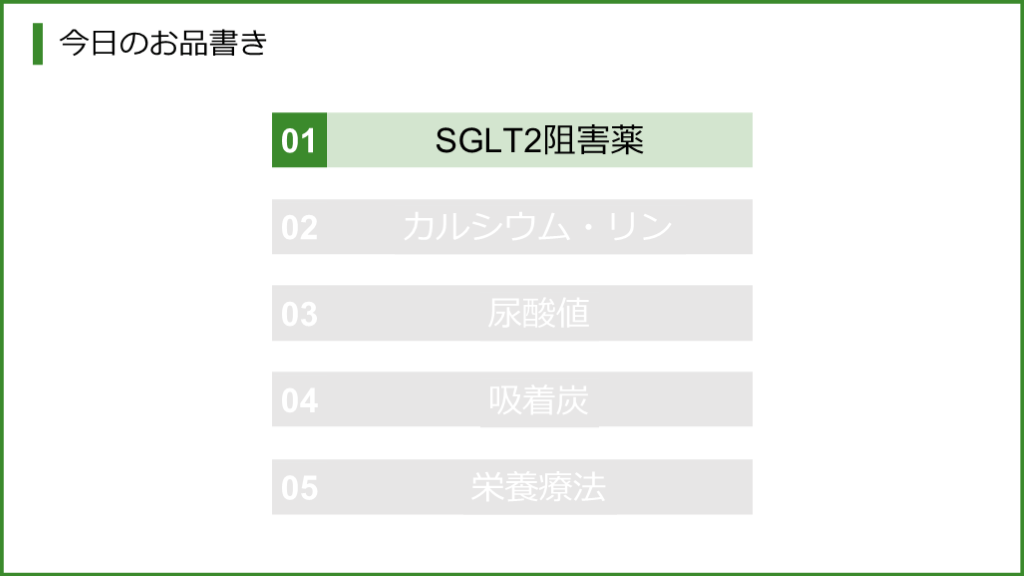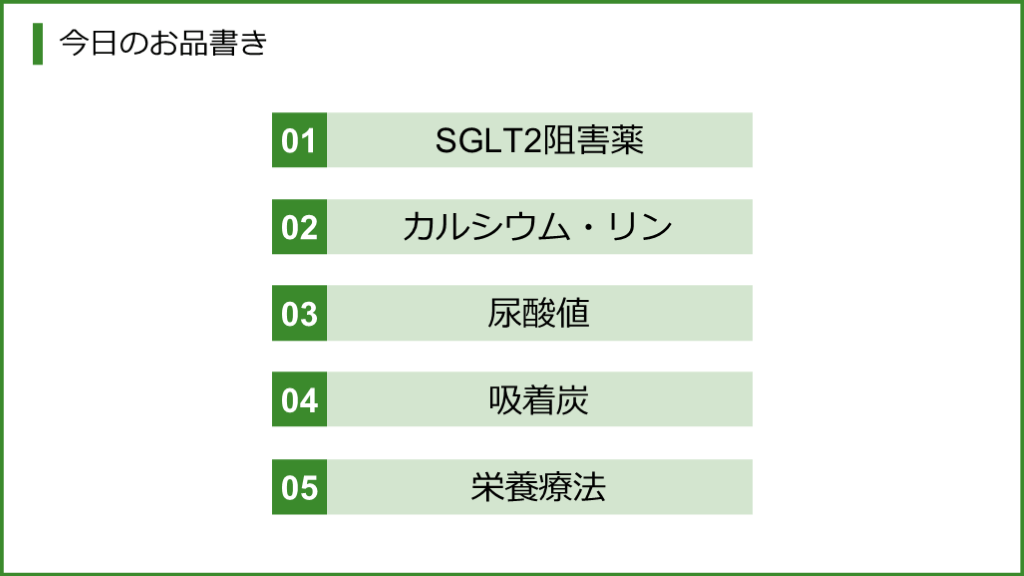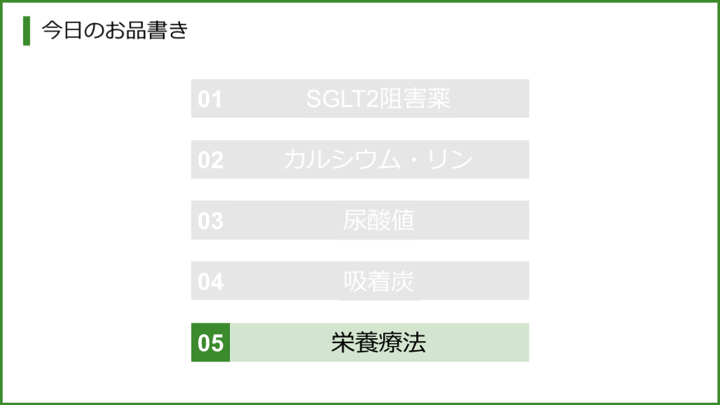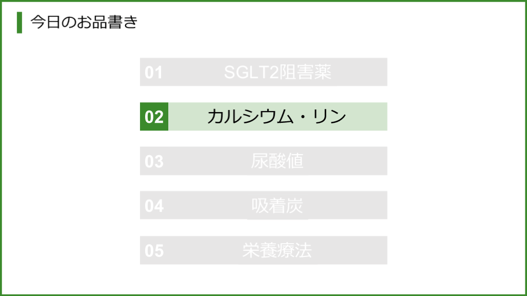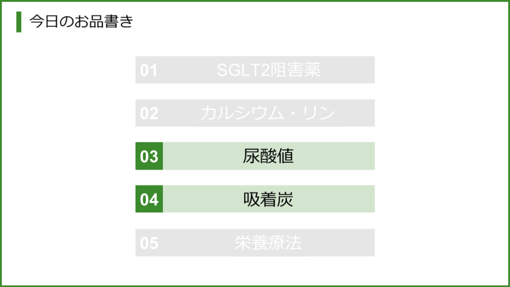 #46. 今日のお品書き 02 カルシウム・リン 03 尿酸値 04 吸着炭 05 栄養療法
