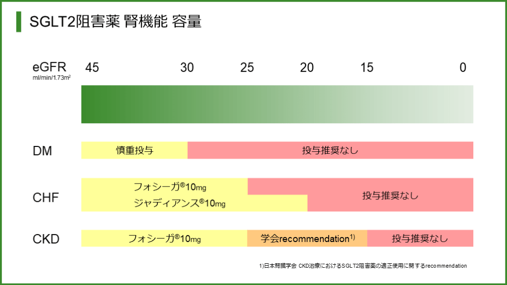 #52. SGLT2阻害薬 腎機能 容量 1)日本腎臓学会 CKD治療におけるSGLT2阻害薬の適正使用に関するrecommendation