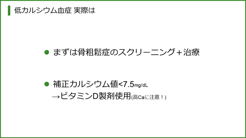 →ビタミンD製剤使用(高Caに注意!) まずは骨粗鬆症のスクリーニング+治療