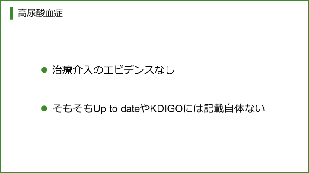 #62. 高尿酸血症 そもそもUp to dateやKDIGOには記載自体ない 治療介入のエビデンスなし