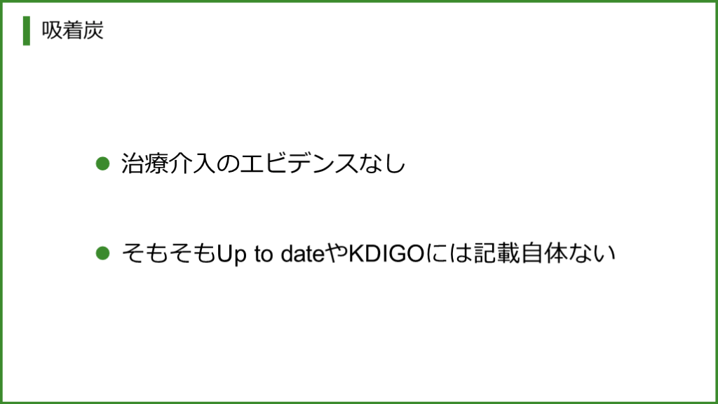 #63. 吸着炭 そもそもUp to dateやKDIGOには記載自体ない 治療介入のエビデンスなし